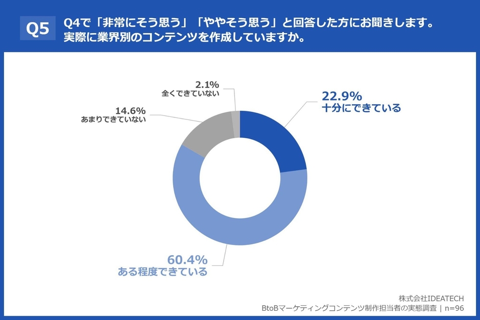 「Q5. Q4で「非常にそう思う」「ややそう思う」と回答した方にお聞きします。実際に業界別のコンテンツを作成していますか。」(n=96)と質問したところ、「十分にできている」が22.9%、「ある程度できている」が60.4%、「あまりできていない」が14.6%という回答となりました。