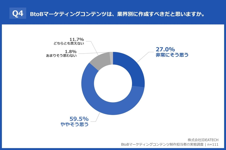 「Q4. BtoBマーケティングコンテンツは、業界別に作成すべきだと思いますか。」(n=111)と質問したところ、「非常にそう思う」が27.0%、「ややそう思う」が59.5%、「どちらとも言えない」が11.7%という回答となりました。