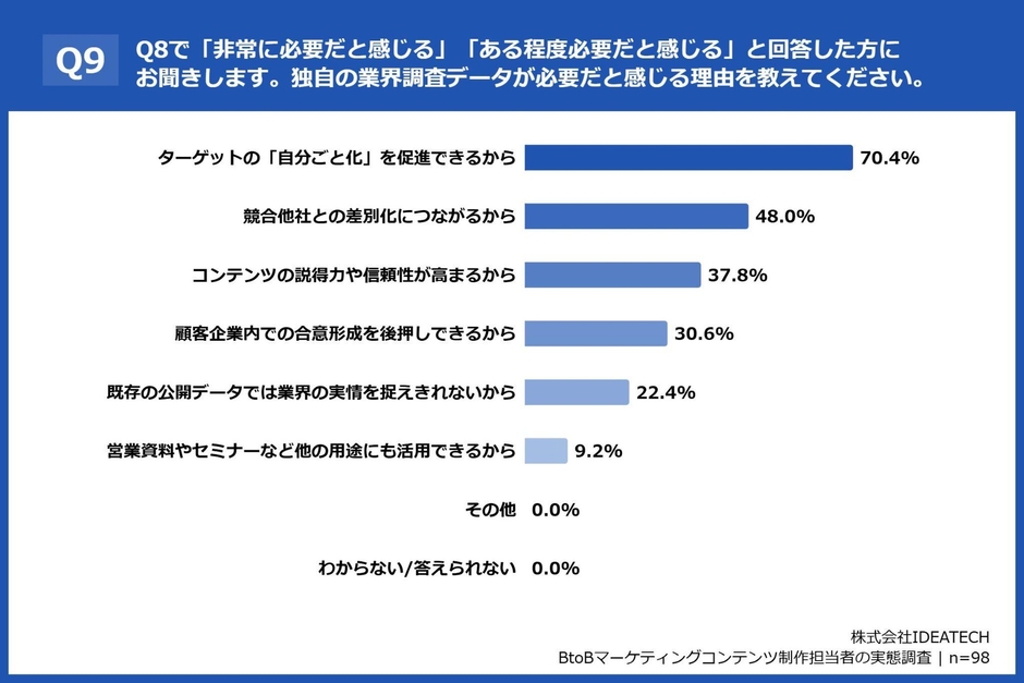 「Q9. Q8で「非常に必要だと感じる」「ある程度必要だと感じる」と回答した方にお聞きします。独自の業界調査データが必要だと感じる理由を教えてください。(複数回答)」(n=98)と質問したところ、「コンテンツの説得力や信頼性が高まるから」が37.8%、「ターゲットの「自分ごと化」を促進できるから」が70.4%、「競合他社との差別化につながるから」が48.0%という回答となりました。