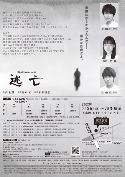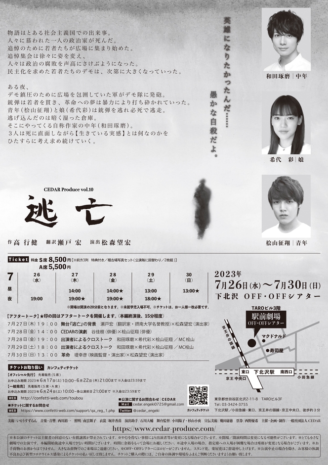 CEDAR Produce vol.10 『逃亡』が2023年7月26日 (水) ~2023年7月30日 (日)に下北沢OFF・OFFシアター(東京都世田谷区北沢2-11-8TAROビル3F)にて上演されます。チケットはカンフェティ(運営:ロングランプランニング株式会社、東京都新宿区、代表取締役:榑松 大剛)にて6月17日(土)10:00より先行発売開始です。