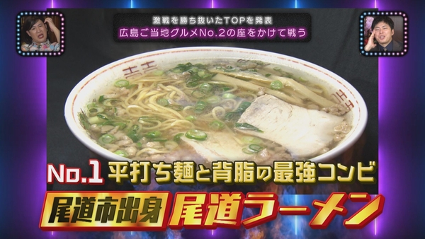 広島のご当地グルメといえば、その筆頭はやっぱり”お好み焼き”!では、No.2は何なのか?ということで街行く広島人100人にアンケートを実施し、第三回「勝手にナンバー2グランプリ 」を開催!うにホーレン、広島つけ麺、牡蠣、汁なし担々麺、がんす、ちーいか、尾道ラーメン、あなご飯、呉冷麺などなど、ご当地グルメの宝庫である広島。お好み焼きに次ぐ、広島ご当地グルメNo.2が今夜決定する!