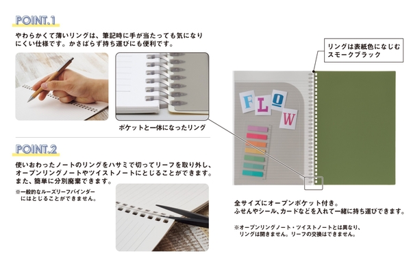 株式会社LIHIT LAB.(本社:大阪市中央区農人橋1-1-22 代表取締役社長:田中宏和)は、2025年10月中旬より、Soffice(ソフィーチェ)シリーズより、新製品(4品番12SKU)を発売いたします。Soffice(ソフィーチェ)シリーズは、やわらかくて薄い独自のリングが特徴です。筆記時に手が当たっても気になりにくく、かさばらないので、持ち運びに便利なノートシリーズです。男性でも手に取りやすい落ち着いた色合いとなっており、また、若年層からビジネスパーソンまで幅広く使える色合いです。既発売品と同じく、今回発売するメモ、A6、A5、セミB5の4サイズとも共通して、オープンポケットが付いており、付せんやシール、カードなどを収納できるようなっております。ちょっとしたメモ書きもオープンポケットに入れて一緒に持ち運べるので、会議やちょっとした外出時に便利です。