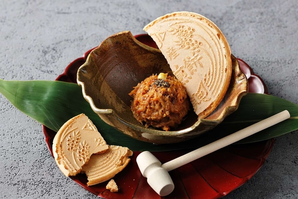 夕食は、プライベート感が保てる半個室のある食事処で、ご当地の食文化を生かした会席料理を提供します。界 雲仙の夕食は、和華蘭文化の1つである卓袱(しっぽく)料理(*3)に欠かせない「豚角煮」をリエットにした先付で始まります。雲仙温泉の名物である水の代わりに温泉水を使用して焼いた「湯せんぺい(*4)」にリエットをつけて味わう一品です。その後、酢の物・八寸・お造りを一緒に盛り合わせた「宝楽盛り」では、卓袱料理の丸い円卓をイメージした鮮やかな朱色の器で提供します。そして、特別会席のメインの台の物は「あご出汁しゃぶしゃぶ」。あごは、正月の雑煮で使用するなど、長崎県で親しみのある食材です。上品な旨味を感じるあご出汁に、牛肉や豚肉をくぐらせ、出汁とともに楽しみます。出汁のアクセントとして、柚子の香りと砂糖の甘さが特徴的な「ゆべし(*5)」を途中で加え、味わうのがおすすめです。鍋料理の締めには、島原名産のうどんをいれ、最後の一滴まで、あご出汁を堪能できます。長崎の豊かな食材と、和華蘭から着想を得た彩り豊かな器や料理から、異国情緒を堪能できるひとときを提供します。