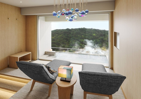 全51室中16室が「和華蘭の間(客室付き露天風呂)」です。湯浴みを中心に滞在できる客室として、客室タイプをあえて「客室付き露天風呂」と名付けました。入浴と休息を交互にたのしめるように露天風呂とベッドルームの境界に「湯上がり処」を設け、リビングルームを取り払いました。開かれた景色に向かい、大胆に置かれた湯上がりチェアで寛ぐ時間を大切に演出しています。目の前の地獄から湯けむりを感じることのできる開放的な露天風呂で堪能した後、「湯上がり処」で外の景色を眺めながらのんびりと滞在できる客室です。