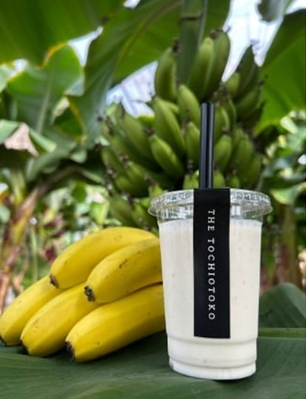 ・国内生産わずか0.1%の香り高くもっちりとした食感の希少品種バナナ「とちおとこ」と千本松牧場牛乳のみで作った「千本松に恋したバナナスムージー」:650円(写真上)