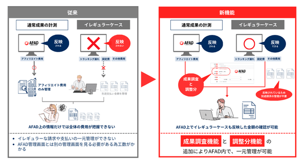 従来、AFADの管理画面では通常フローで発生しない請求・支払いを確認する方法がありませんでした。通常フローで発生しない請求・支払いとは、例えば「トラッキング漏れ等で反映されなかった成果」と「アフィリエイト報酬とは別に計上する固定費や補填費」を指します。