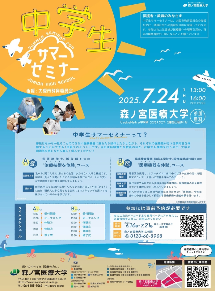 7月24日(木)、森ノ宮医療大学(大阪市住之江区、学長:青木 元邦)は中学1~3年生を対象に医療の仕事を体験できるイベント「中学生サマーセミナー」を開催します。普段なかなか見ることのできない医療機器に触れたり操作したりしながら、医療職が行う仕事内容を体験できる本学独自のイベントとなっています。プログラムは「治療技術を体験」できるコース(鍼灸師、言語聴覚士)、「医療機器を体験」できるコース(臨床検査技師、臨床工学技士、診療放射線技師)の2種類をご用意!参加費は無料、保護者・ご家族の方も同伴可能です(2名まで)。聞いたことはあるけど詳しくは知らない、そんな医療のお仕事を知るチャンスですので、ぜひこの機会にご参加ください!