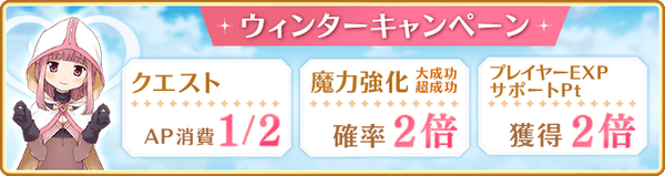 クエストAP1/2、プレイヤーEXP&サポートPt2倍、魔力強化大成功&超成功率2倍