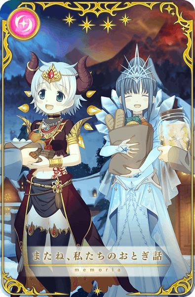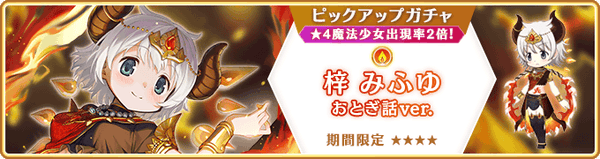 本ガチャでは、魔法少女「梓みふゆ おとぎ話ver.(CV.中原麻衣)」をはじめ、新メモリア「完全なハッピーエンド」やメモリア「終わらないで、おとぎ話」「幼馴染なふたり」が期間限定で登場いたします。
