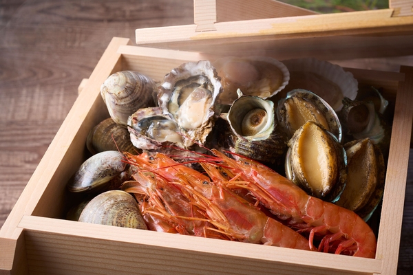 左)お席で蒸したて熱々をお召し上がりいただける海鮮浜蒸し。ホタテやアワビ、サザエ、牡蠣など豊富な魚介類をご用意しております。