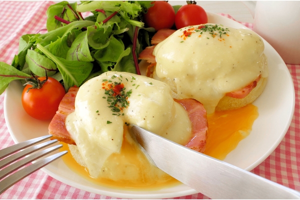 左)ホテルやカフェのおしゃれ朝食として人気のエッグベネディクト。ポーチドエッグとソースが絡み、旨みたっぷりの味わいです。