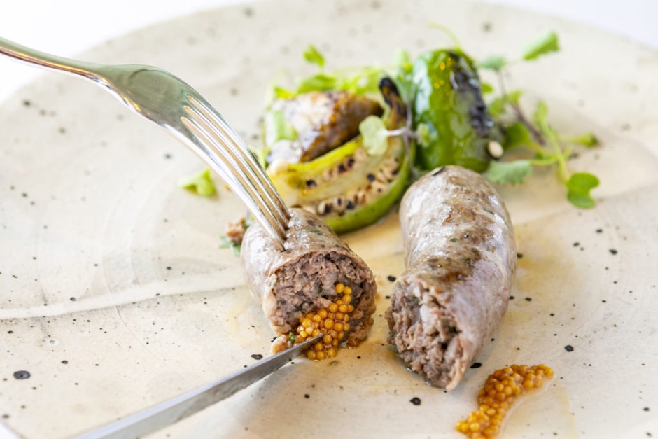 「リストランテKubotsu」でフェア期間内に提供する料理は、「糸島産猪の自家製サルシッチャと九州の旬野菜」。自ら糸島ジビエ研究所に赴き、代表の西村直人さんに正しいジビエの扱い方などを教わりながらソーセージの開発を行いました。薬味やハーブなどを加えて作った自家製ソーセージは、タンパク質を凝固させない温度でゆっくりと茹でた後に炭火で焼き、柔らかくジューシーに仕上げています。