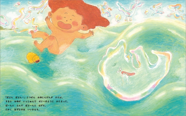 おゆのうえを、ぼよんぼよんとはずんだり、イルカになったおゆにんげんの背中にのっておよいだり、おゆのひこうせんでそらを飛んだり、おゆにんげんたちと大冒険をおもいっきり楽しみます。