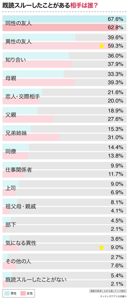 男女とも次に多いのは「異性の友人」ですが、男性は39.6%、女性は59.3%と、その差が19.7ポイントもありました。男性に比べて、女性のほうが「異性の友人」のメッセージを既読スルーする割合が高いことが分かります。また、「気になる異性」についても女性は9%が既読スルーをすると回答しており、男性の3.6%に比べると高くなっています。