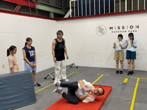 いよいよ実践へ。パルクールの基本は、意外にもにも安全第一を前提とした受け身。体幹とバランス感覚を駆使して何とか基礎を学んだ3人。最後は3人力を合わせて、華麗にトリックを決めに行く!
