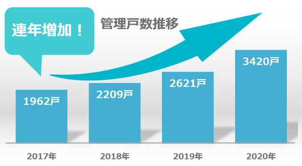 賃貸管理戸数、連年増加! 前年比30.5%増。2020年管理物件戸数は3400戸を突破。