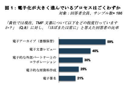 ただし、eTMFプロセスの実行にはかなりのばらつきがあります。電子署名(21%)、電子的な原資料作成(25%)、電子的な外部パートナーとのコラボレーション(30%)を「ほぼまたは常に」実行している企業はいずれも全体の3分の1未満でした。