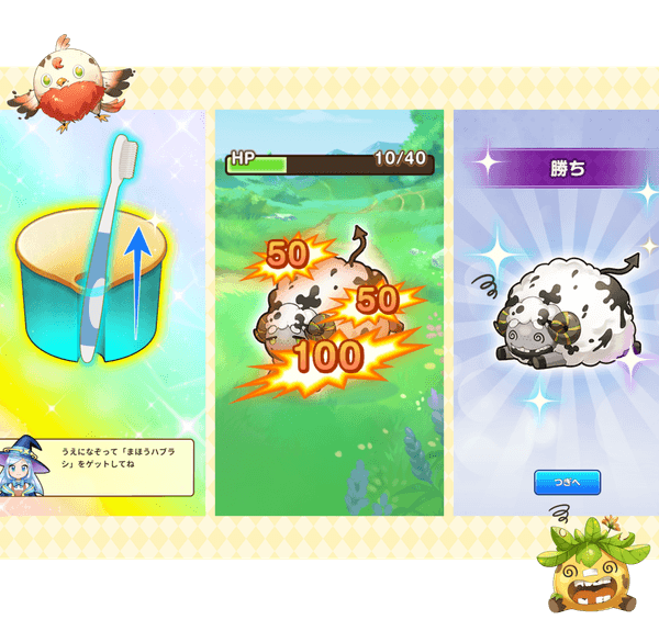 ステージの変化は、単なるデザイン変更ではなく、子どもが「冒険している感じ」や「自分が成長している感覚」をしっかり得られるように考慮しています。さらに、進行に合わせて敵キャラがどんどん強くなり、ステージも冒険の難易度が上がっていきます。毎日のゲーム体験に変化をつけつつもパターン化しすぎず、仕様が広がりすぎないバランスにも注意を払っています。子どもたちが毎日楽しみながら、無理なく歯みがきのスキルを向上できるアプリです。