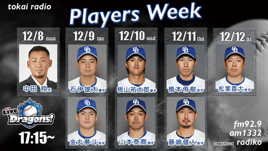 TOKAI RADIOは、12月8日(月)から12日(金)の「Live Dragons!」(月曜日17時15分~18時00分/火曜日~金曜日17時15分~19時00分)を「Players’ Week」と題し、中日ドラゴンズのキーマンが生出演する特別企画を送る。DJは、平松伴康。