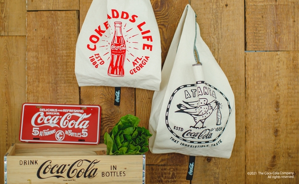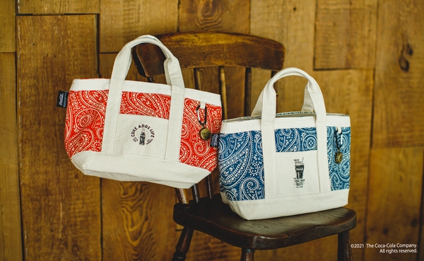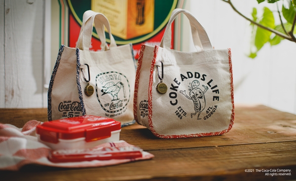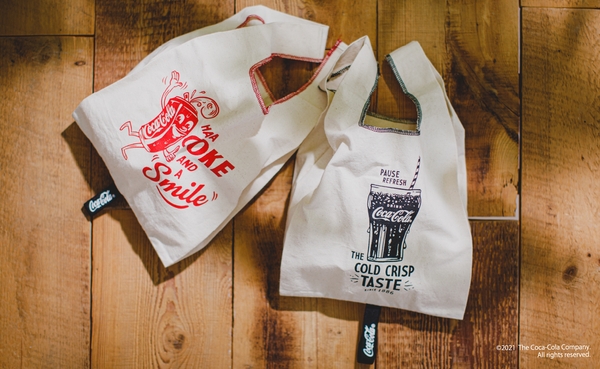 ショッピングバッグは折りたたんで小さくなる実用性を備えながら、留めゴムにもロゴをデザイン。ミニトートには「コカ·コーラ」の柄があしらわれたペイズリー柄を使用し大人っぽいデザインに仕上げました。