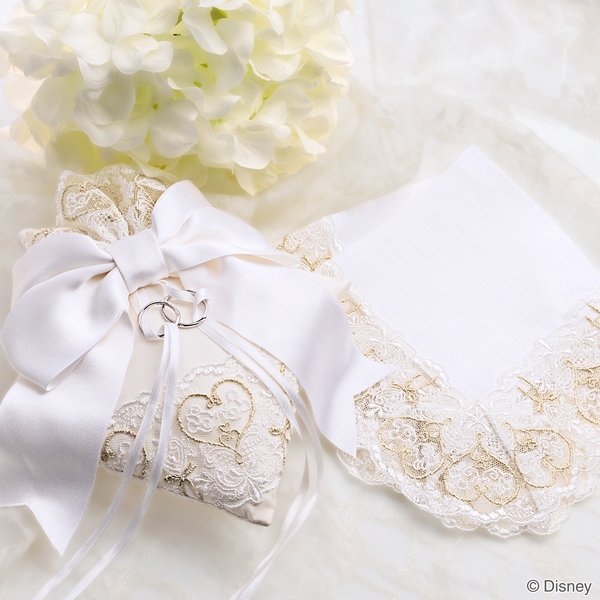 特典:ブライダルジュエリーご成約の方に、「ミッキー」と「ミニー」を繊細に刺繍したリングピローまたはハンカチをプレゼントします。