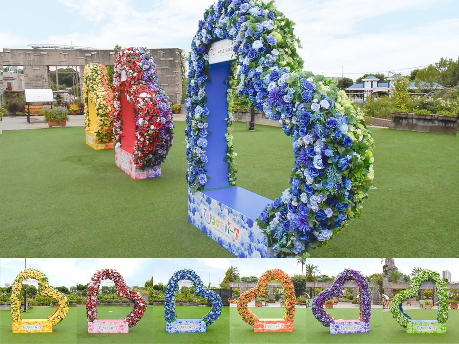イエロー、レッド、ブルー、オレンジ、パープル、グリーン、6色のバラで飾られたハート型のベンチ。ご好評につき、継続して設置します。
