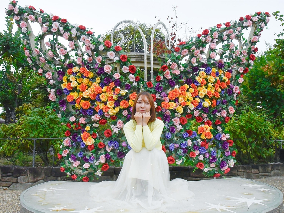 バラのフェイクフラワーで装飾された蝶々が登場。中央に立つと、まるで美しく羽を広げたような写真が撮影できます。