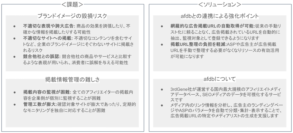 ビズテーラー・パートナーズ株式会社(本社:東京都港区、代表取締役:倉持良、以下「ビズテーラー・パートナーズ」)は、株式会社3rdGene(本社:東京都世田谷区、代表取締役社長:諸星慎二、以下「3rdGene」)が提供するアフィリエイト広告向けSEOデータ分析ツール「afdb」との連携を開始いたしました。本取り組みにより、広告掲載URLの網羅的な自動取得が可能となり、アフィリエイト・サービス・プロバイダー(ASP)におけるアフィリエイト広告の監視精度と効率性が向上します。また、広告主にとって意図しない不適切なサイトへの広告掲載を削減し、ブランド毀損リスクの低下にも寄与します。
