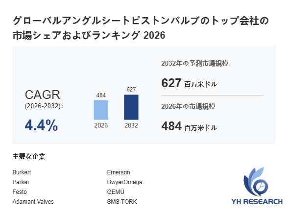 YHResearch調査チームの最新レポート「グローバルアングルシートピストンバルブのトップ会社の市場シェアおよびランキング 2026」によると、2026年の484百万米ドルから2032年には627百万米ドルに成長し、2026年から2032年の間にCAGRは4.4%になると予測されています。