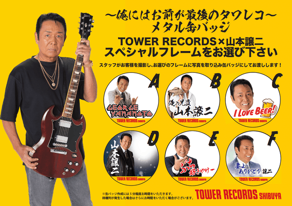 スタッフがお客様を撮影し、お客様からお選びいただいたTOWER RECORDS×山本譲二スぺシャルフレーム(全6種)に撮影した写真をその場で取り込み缶バッジにしてお渡しします!スペシャルフレームは全6種類!好きなフレームをお選びいただけます!(山本譲二本人とのツーショット撮影のお客様はフレームはお選びいただけません)