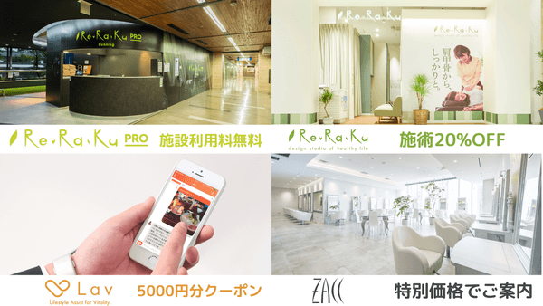 Re.Ra.Ku Group (リラク グループ) は「Re.Ra.Ku 」を中心に全国に300店舗以上のリラクゼーションスタジオを展開しています。商業施設や路面店に展開をする「Re.Ra.Ku 」以外にも、温浴施設に展開する「Spa Re.Ra.Ku 」、複合型ランニングステーションを展開をする「Re.Ra.Ku PRO」、地方を中心にリフレクソロジーやアロマボディケアなどの豊富なメニューを展開する「Bell Epoc」、アジアン手技を展開する「Ruam Ruam」の5つのブランドを展開しています。