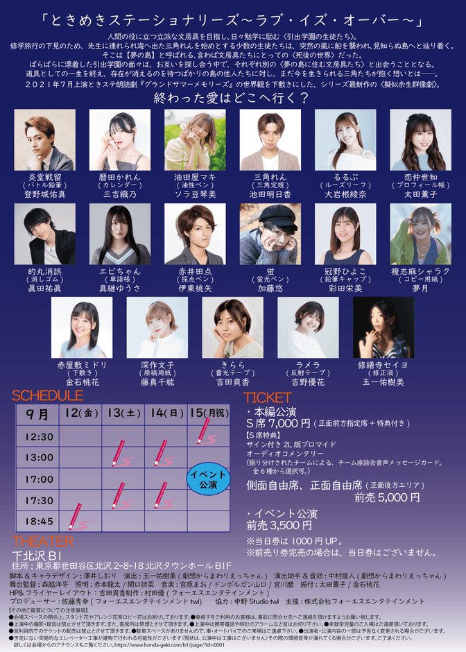 『ときめきステーショナリーズ~ラブ・イズ・オーバー~』が2025年9月12日 (金) 〜 2025年9月15日 (月・祝)に下北沢B1(東京都 世田谷区 北沢 2丁目8−18 北沢タウンホール地下1階)にて上演されます。
