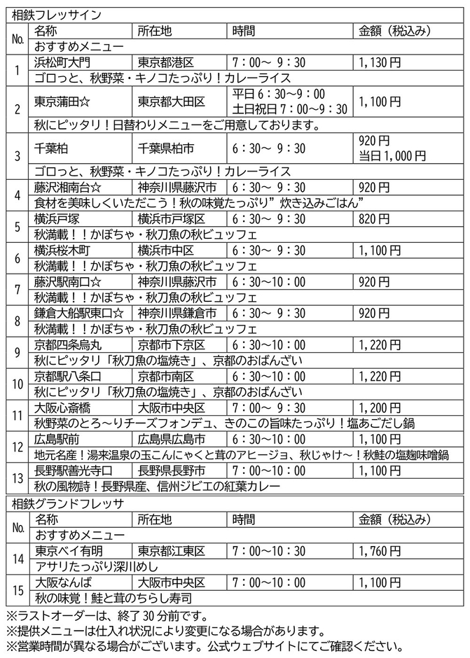 これは、全国の15店舗で、秋の味覚を楽しめる朝ごはんを期間限定で提供するものです。「相鉄フレッサイン 京都四条烏丸」「相鉄フレッサイン 京都駅八条口」では、秋にぴったりの「秋刀魚の塩焼き」や京都のおばんざい、「相鉄フレッサイン 長野駅善光寺口」では、長野県産の鹿肉を使った「信州ジビエの紅葉カレー」、「相鉄グランドフレッサ 東京ベイ有明」では、「アサリたっぷり深川めし」など、地域独自に工夫を凝らした、秋を感じられるおすすめの朝食メニューをご用意します。