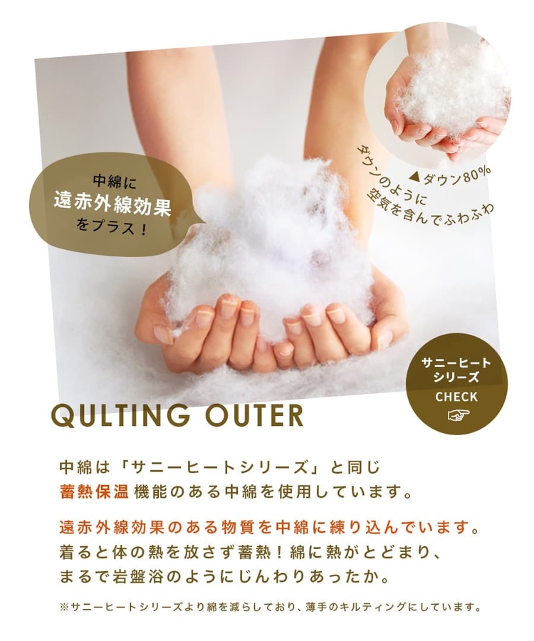 遠赤外線効果のある物質を中綿に練り込んでおり、中綿に熱がとどまり蓄熱することで、まるで岩盤浴のようにじんわりと暖かく着ていただけます。