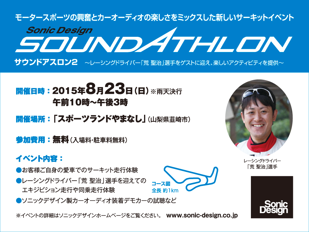 2015年6月26日 10:00株式会社ソニックデザイン(千葉県千葉市中央区南町2-6-18、社長:佐藤 敬守)は、モータースポーツの興奮とカーオーディオの楽しさをミックスした新しいサーキットイベント「ソニックデザイン サウンドアスロン2」を、来る2015年8月23日(日)に「スポーツランドやまなし」(山梨県韮崎市)で開催します。