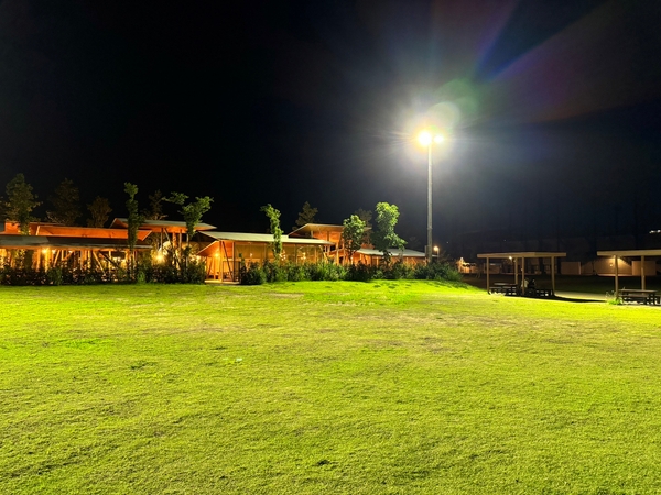 「堺原池 BBQ matoi」の隣地にある芝生広場に夜間照明を追加で設置し、運用を開始しました。この照明により、夜間でもボール遊びができるほど明るくなり、死角も少なくなったため、防犯上の観点でも大きく向上しています。