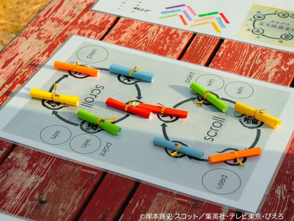 本ゲームは、忍界に存在する五大性質「火」「水」「土」「雷」「風」の関係を使い、相手の出方を読みながら勝負する頭脳バトル。どの巻物を出すのか、いつ切り札を使うのか—。一瞬の判断が勝敗を分ける、白熱の心理戦が楽しめます。