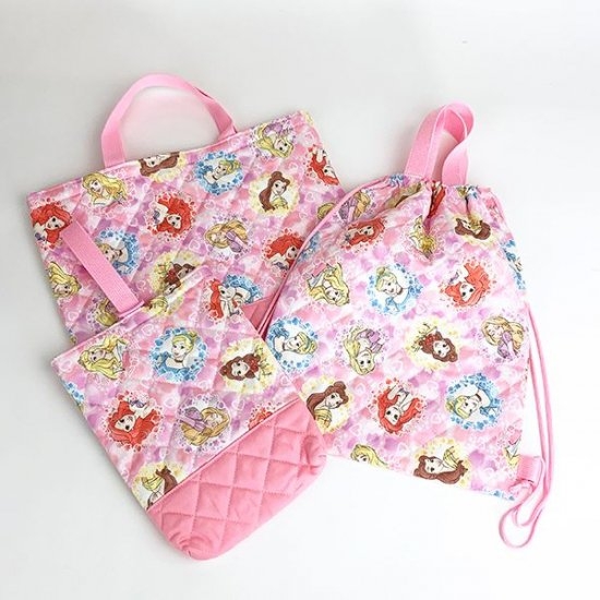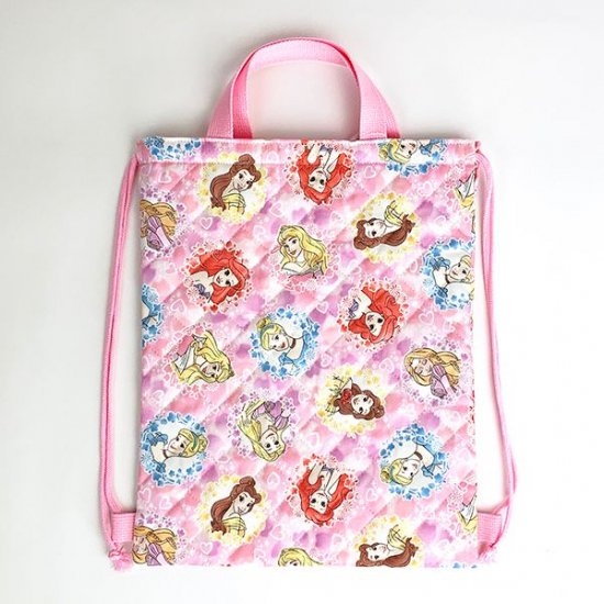 最後に、ディズニープリンセスが一面にプリントされているキュートなサップサックをご紹介。ピンクの背景がガーリーな印象を醸し出していますね。憧れの存在であるプリンセスたちと一緒に通園できるなんて、きっと嬉しいですよ♪サイズは、390×320mmです。