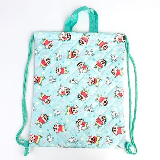 次に、クレヨンしんちゃんのナップサックをご紹介します。ふんわりした青っぽい背景にしんちゃんの赤と黄色のお洋服が映えますね。飼い犬であるシロもいますね。サイズは、400×330mmです。