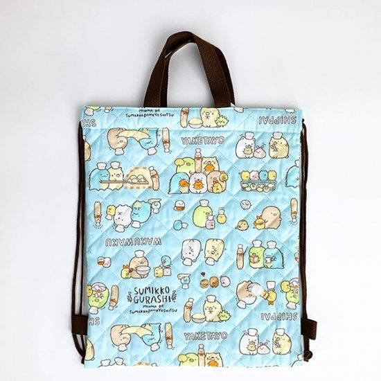 まずは、こちらのすみっコぐらしのナップサック。キルト生地で手触りもGOOD♪パンを焼いているすみっコたちがとっても可愛いですよね。メインキャラクターだけでなく、すみっコたちが全員集合しているのも嬉しいポイント!サイズは、390×320mmですよ。A4ノートは楽々収納出来そうですよね。