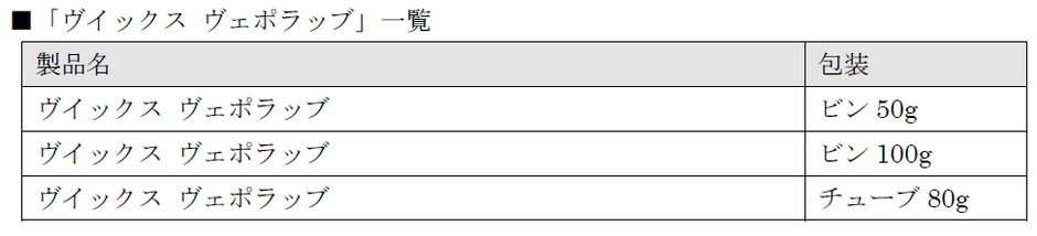 大正製薬株式会社[本社:東京都豊島区、社長:上原 茂](以下、当社)は、塗るかぜ薬ブランド「ヴイックス ヴェポラッブ」全製品につきまして、2025年9月30日(火)をもちまして、当社からの販売を終了させていただくことになりましたのでお知らせいたします。