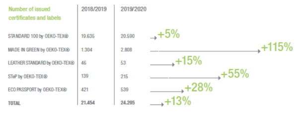 エコテックス®国際共同体の調べでは、 2019年-2020年度の年間実績としてエコテックス®認証全体で24,205件の認証を発行し、13%の伸びを記録。環境負荷や労働背景なども含めた企業や工場のサステナブル証明「STeP」は新規認証が55%増加し、さらにはエコテックス®最高峰のラベルであるトレーサビリティ証明「MADE IN GREEN」の取得件数は1,304件から2,808件と前年対比215%となり、急速に伸びていることがアニュアルレポートと共に報告されています。