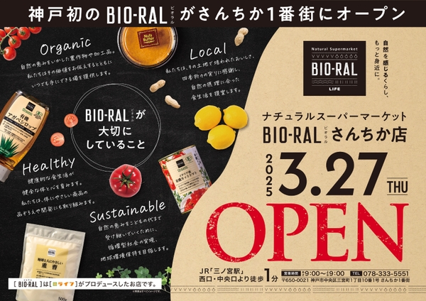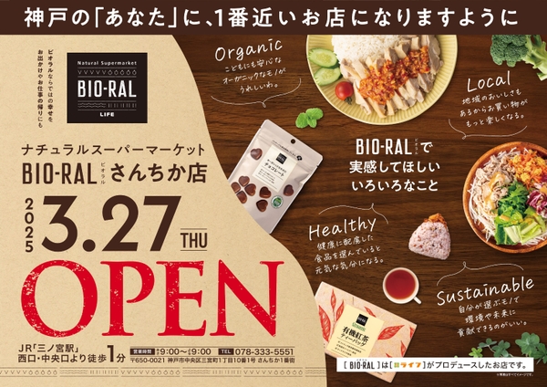 「ビオラルさんちか店」では、駅直結型の特性を活かして、近畿圏のビオラルでは初となる対面のお惣菜コーナーを設置し、プライベートブランド「BIO-RAL」や食品添加物に配慮した原料を使用した彩り豊かなお惣菜をご提供いたします。また、「神戸洋藝菓子ボックサン」や「淡路島ばぁむ」など、一部のコーナーで地元・兵庫県や神戸市でつくられた商品を取り扱いいたします。高まる健康志向や安全・安心へのニーズにお応えし、お客様の心と体の健康と豊かな毎日のお手伝いができるよう、従業員一同でお客様をお迎えする準備を進めておりますので、オープンまでどうぞお楽しみにお待ちください。