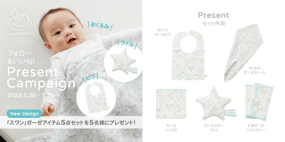 株式会社ダッドウェイ(本社:神奈川県横浜市、代表取締役社長:白鳥 公彦)が展開する「D by DADWAY(ディーバイダッドウェイ)」は2022年1月20日より「家族の日常に寄り添うテキスタイル」をコンセプトとし、リブランディングを実施します。白鳥モチーフのロゴマークに一新し、ブランドサイトをリニューアルしました。「家族みんなが使いやすい」デザインはそのままに、より作り手の想いをテキスタイルにのせた商品をお届けいたします。この度のリブランディングを記念してデザインされた、新しいテキスタイル「スワン」を新発売。「スワン」のアイテムをプレゼントするキャンペーンを、D by DADWAYのInstagramアカウントにて開催します。