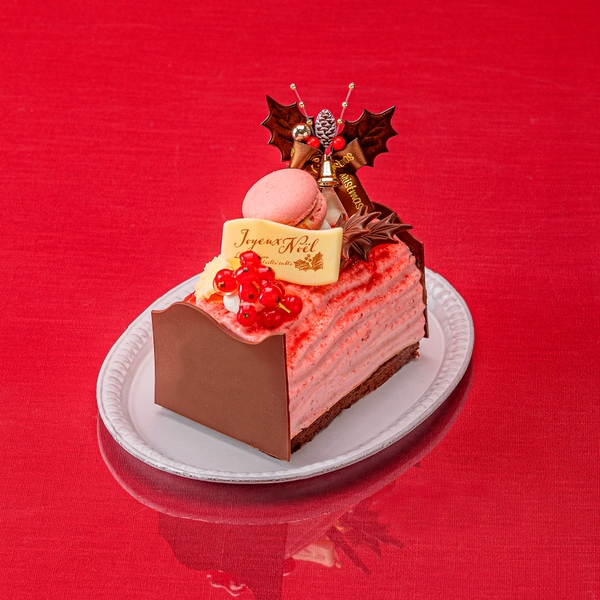 濃厚なガトーショコラ、チョコレートムースをいちごのムースで包み込み、アクセントにフィヤンティーヌとベリーのジュレをしのばせました。フランボワーズマカロンが可愛らしい限定ケーキです。
