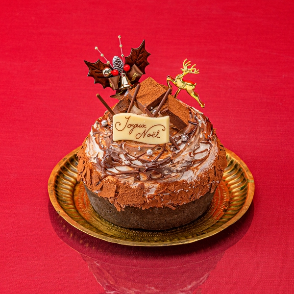 なめらかなチョコレートムースで塩キャラメルのババロアを包み、アクセントにフィヤンティーヌとパッションフルーツ&アプリコットジャムをしのばせ、ショコラフロマージュタルトに重ねました。とろける生チョコレートを贅沢に飾った、クリスマスだけのチョコレートタルトです。