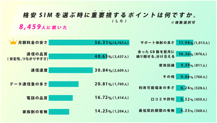 格安SIMを選ぶときのポイントについて伺ったアンケートでは、「月額料金の安さ」がもっとも多く56.31%という結果に。次いで「通信の品質:40.63%」「通信速度:30.84%」となりました。