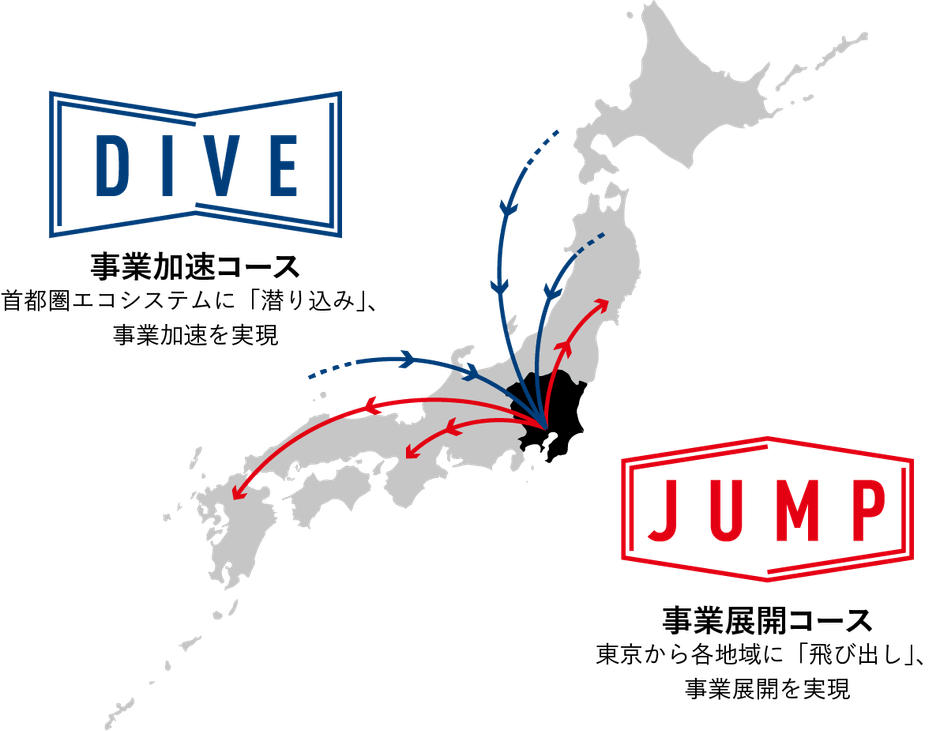 一方、東京都内で活動するスタートアップを対象とした事業展開コース 「JUMP」 では、東京から各地域へと“飛び出し”、全国展開に向けた事業創出を推進します。