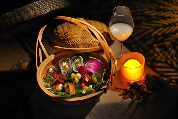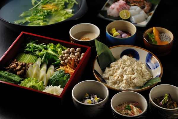 ブルーゾーンの食事は、植物性食品、豆類を中心としている点が特徴です。夕食には、沖縄で親しまれる野菜をたっぷり使用した特別な鍋を、客室で提供します。魚介出汁のスープに、固まる直前の柔らかい食感が特徴の「ゆし豆腐」を加えながら野菜をたっぷり楽しめます。副菜は植物性食品を豊富に使用した小鉢4品と、豆類やフルーツを使ったデザートです。客室に備わる調理家電を利用して、好きなタイミングで仕上げられるため、時間を気にせずプライベート空間でゆっくり味わえます。