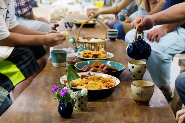 ブルーゾーンにみられる伝統文化の継承、助け合いの精神、生きがいを持つことは、健康長寿へ大きく寄与していることがわかっています。この学びを深めるため、滞在の中日には、読谷村内の「やちむん(やきもの)の里」にある陶房へ向かい、陶工の作業を手伝います。時期によって必要な作業は異なり、火入れや、土取り、型押しなどの体験ができます。作業後は、お茶とお菓子を囲んで会話を楽しむ、沖縄で親しまれる習慣のひとつ「三時茶(さんじちゃー)」に、陶工と一緒に参加します。協力して進めるやちむん作りの一員になる体験と、会話を楽しむ習慣に触れて、人とのつながりを大切にする沖縄らしい暮らしを感じられます。
